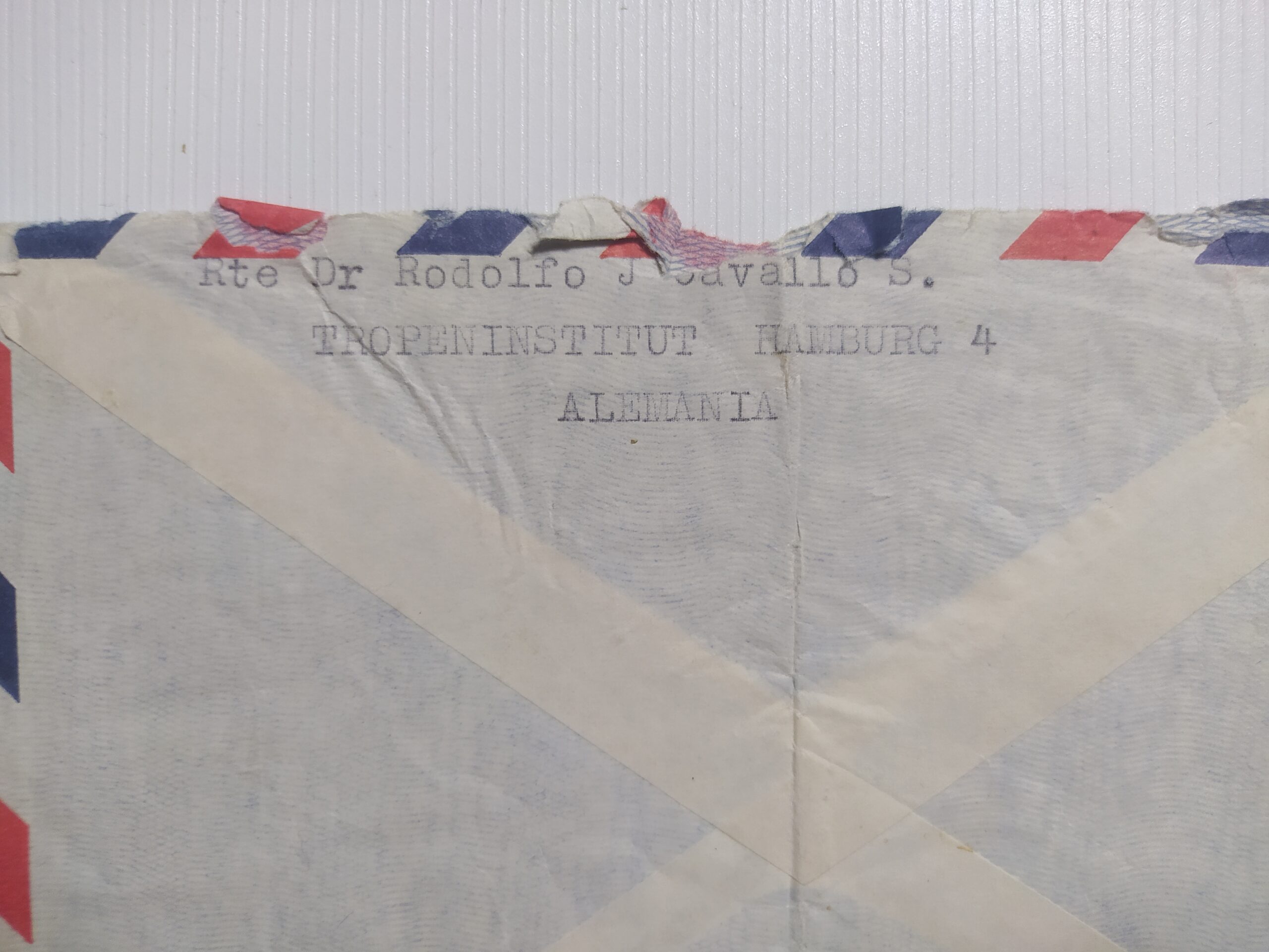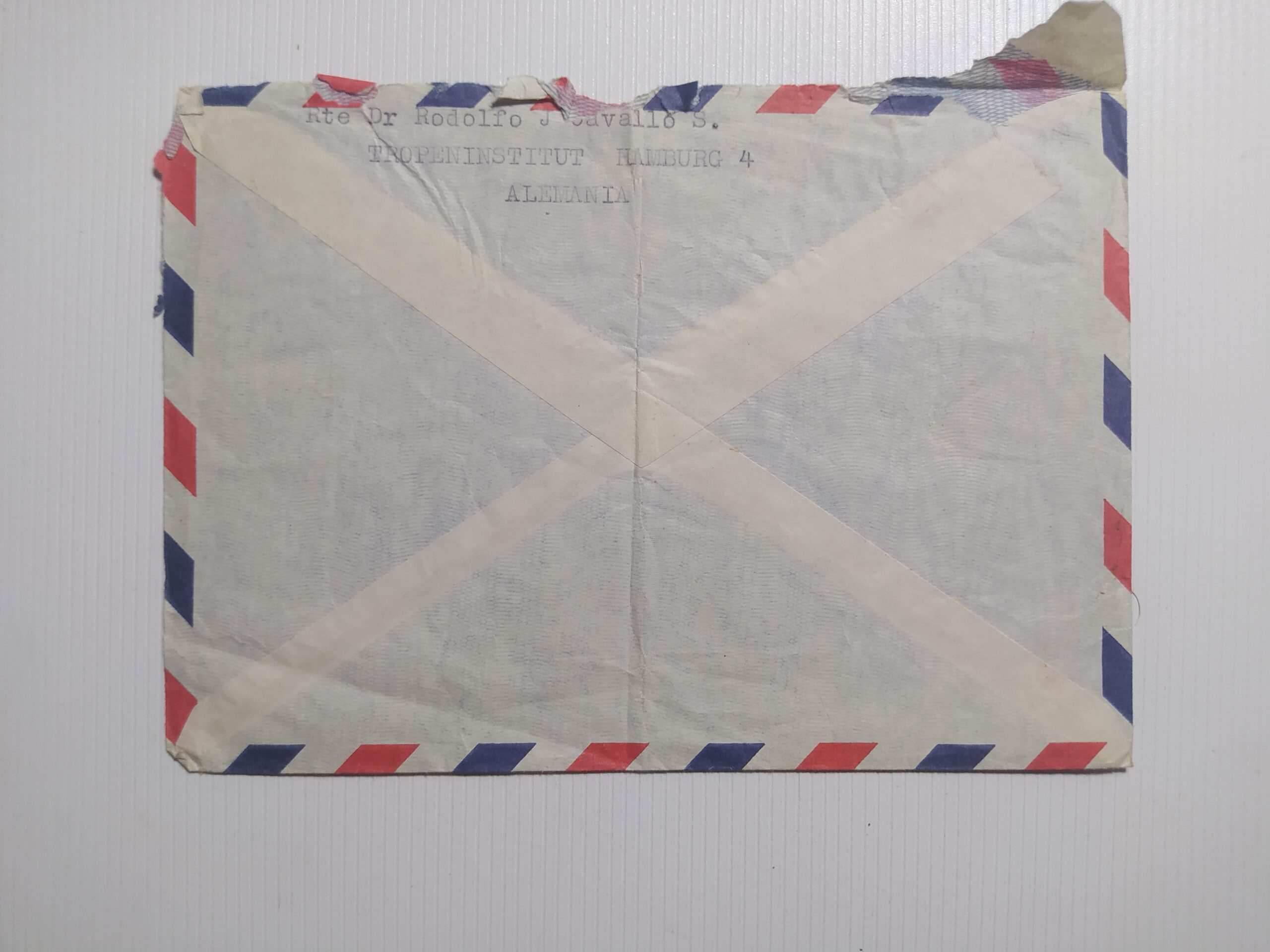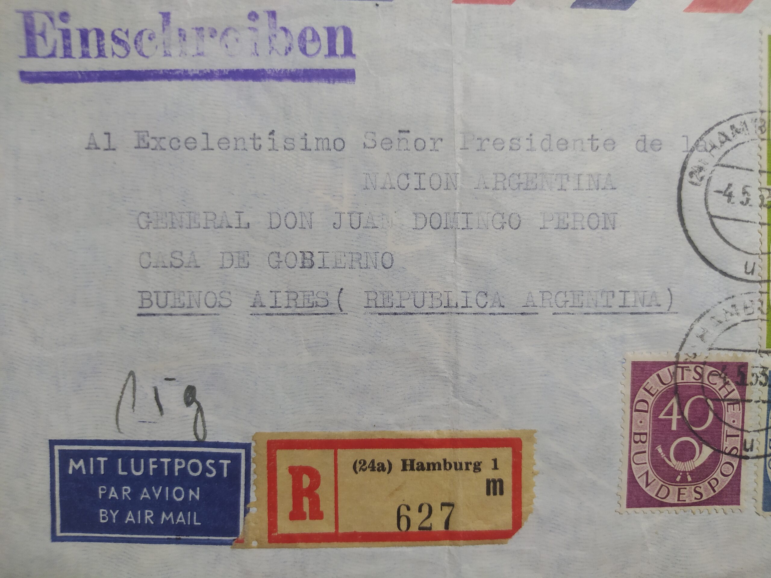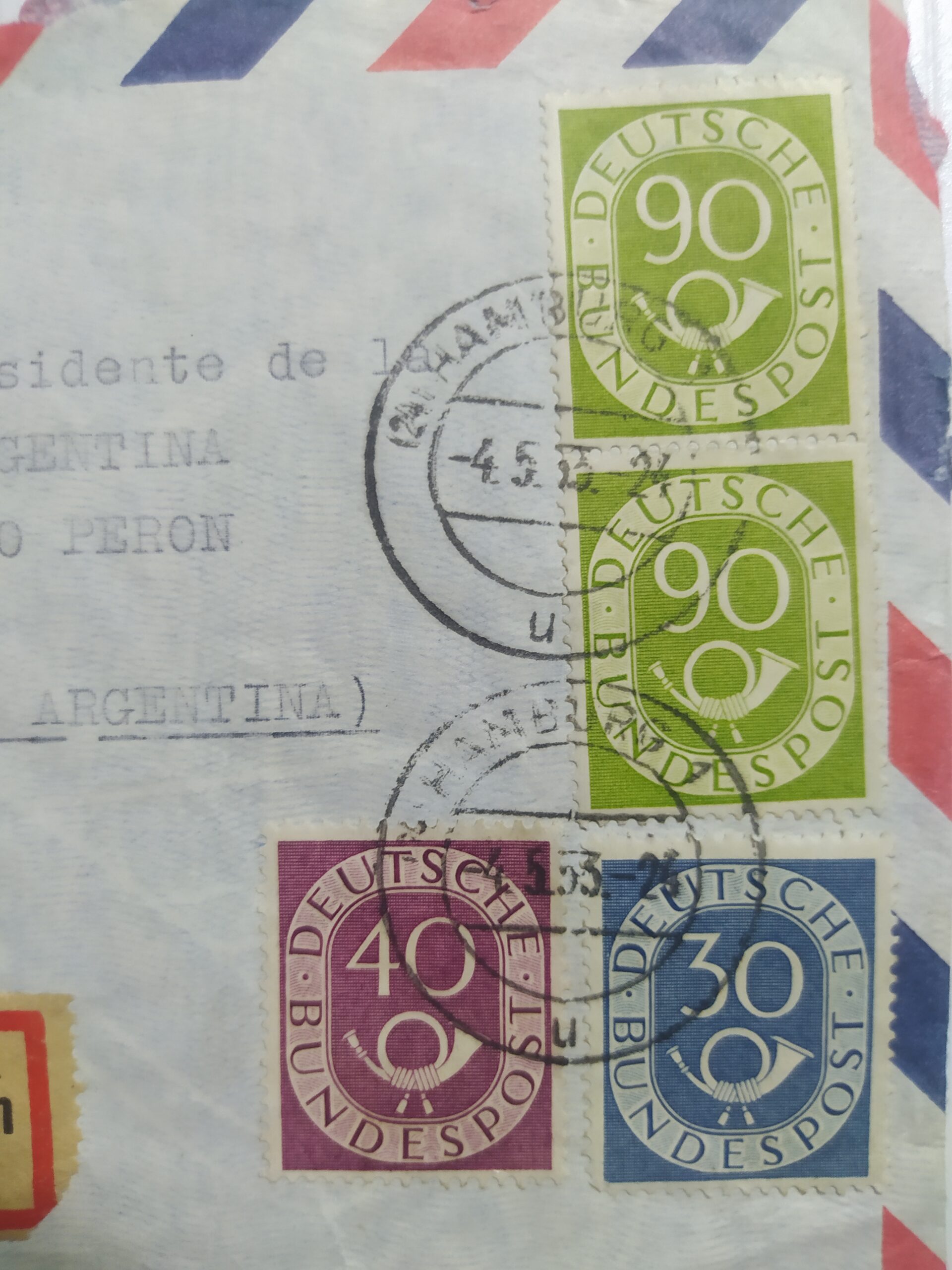 Sobre original histórico enviado desde Hamburgo, Alemania, al Presidente de la Nación Argentina, General Juan Domingo Perón, durante la década de 1950 (periodo presidencial peronista).